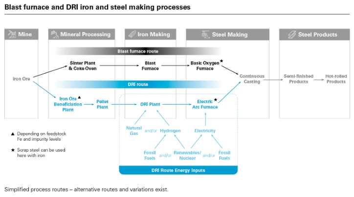 Rather than the traditional blast furnace steel-making process, which can accommodate various types of iron ore feedstock, the DRI process requires iron ore pellets that are of low impurity and high iron content. This means that the rise in steel-making via the DRI process also requires an increase in the number of iron ore mines and/or beneficiation capability to meet the relatively narrow specifications for the DRI process. While there are different beneficiation technologies available, the exact solution generally needs to be matched to the particular specifications of the iron ore deposit, creating relatively long engineering and project development timelines for these mineral processing facilities. Accordingly, miners with iron ore suitable for DRI and/or companies with advanced beneficiation capability, are expected to be well placed to supply iron ore to the new generation of DRI projects as they enter production in the coming years.