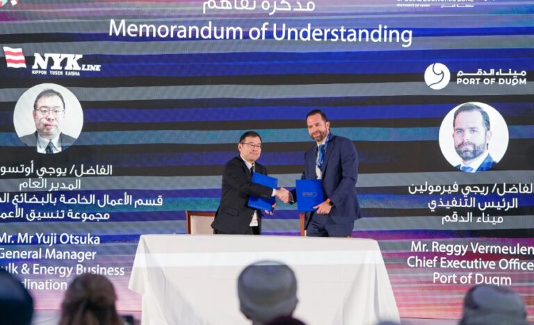 Japanese shipping major Nippon Yusen Kabushiki Kaisha (NYK Line) and the Port of Duqm Company (PODC), which oversees port management and terminal operations in Oman, have signed a comprehensive memorandum of understanding (MOU) to collaborate on the development and connectivity of the Port of Duqm.