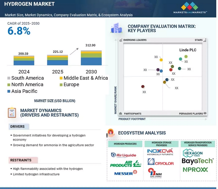 The global hydrogen market is projected to reach USD 312.90 billion by 2030 from USD 225.12 billion in 2025, registering a CAGR of 6.8%. The hydrogen market is on a growth trajectory driven by the increasing trend of switching to low-emission and sustainable energy solutions for transportation, power generation, and industrial uses.